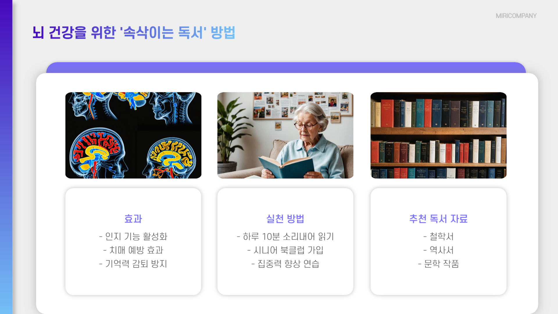 - 소설보다는 **철학, 역사서**가 뇌 활성화에 더 효과적