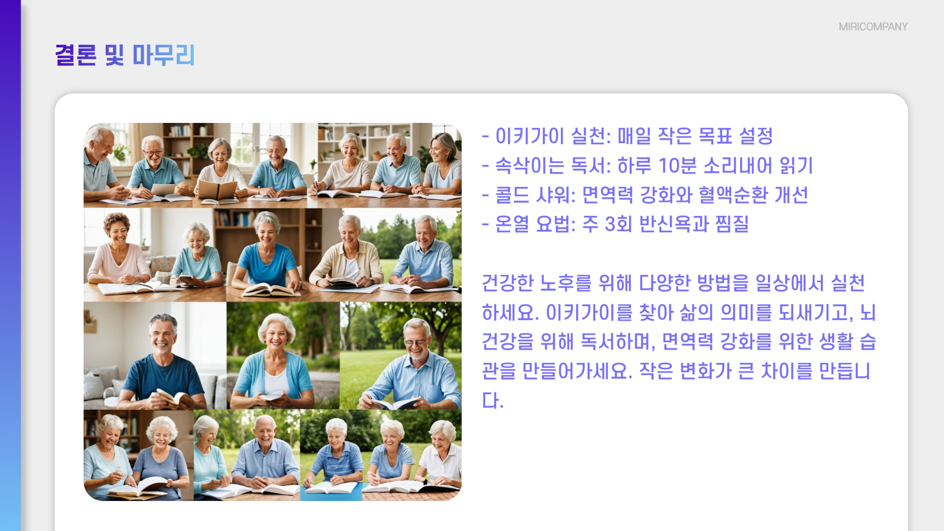 - 매일 **작은 목표 설정** (예: 정원 가꾸기, 봉사 활동 등)