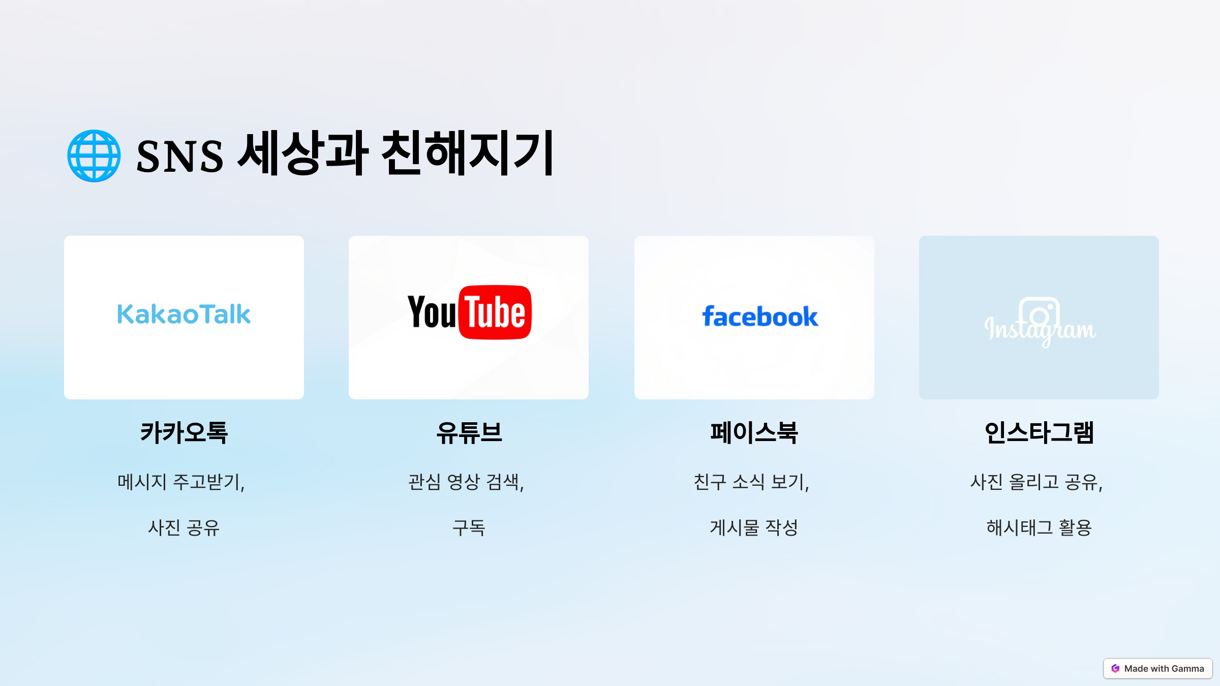 사회적 연결망(SNS)은 사람들과 소통하는 좋은 도구입니다. 대표적인 SNS와 기본 사용법을 소개합니다.